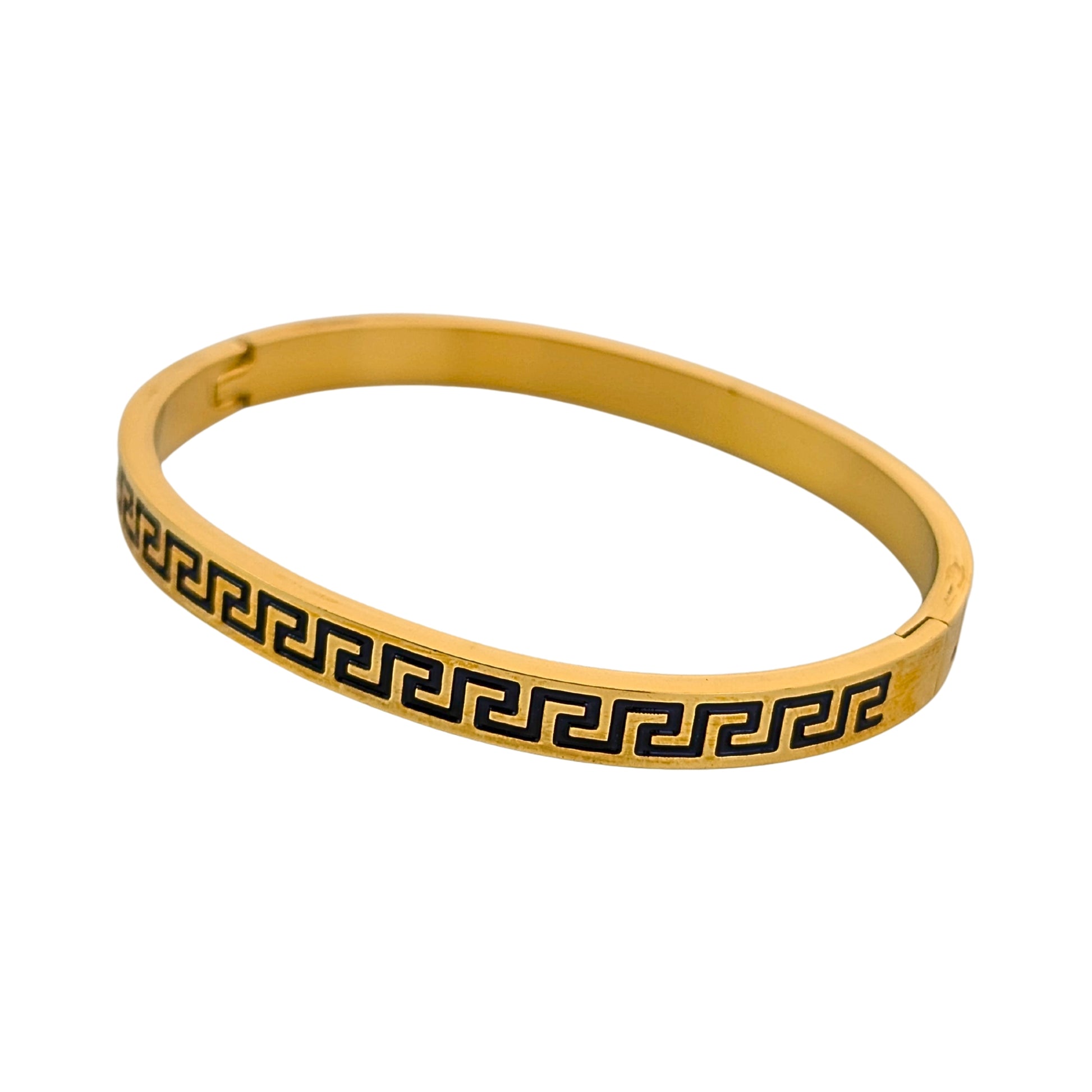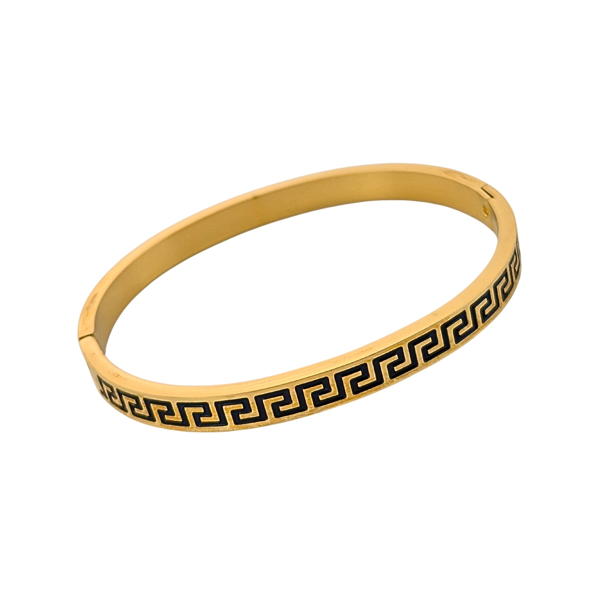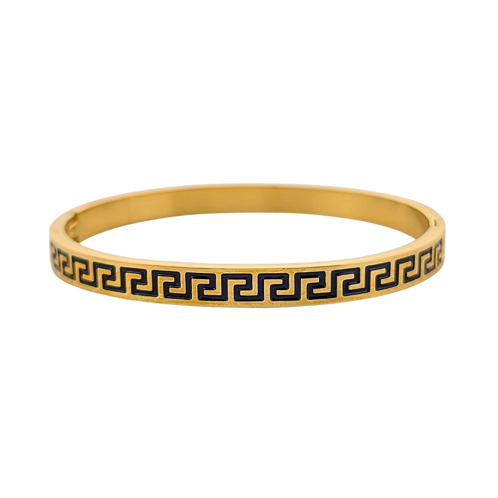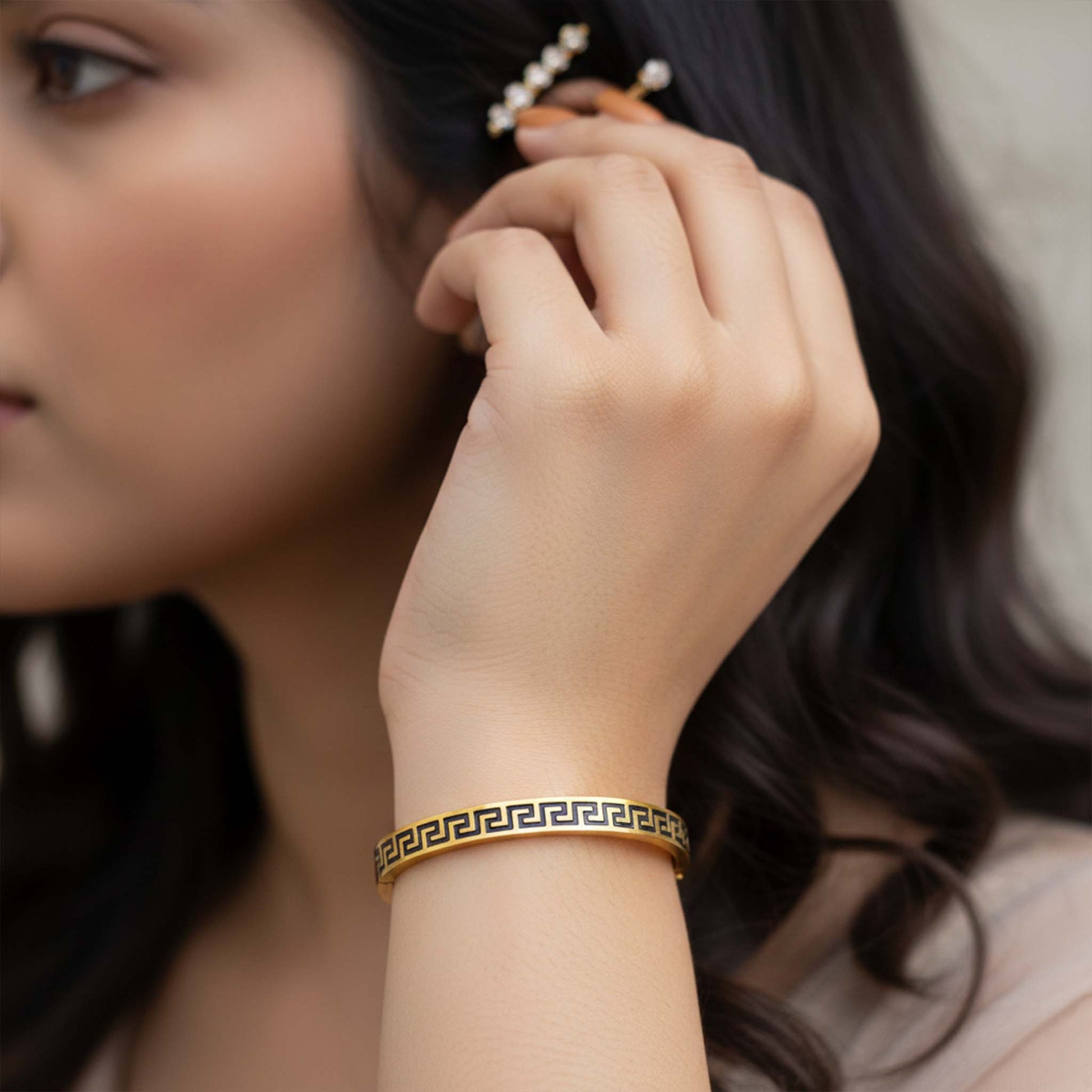 In a world of fleeting trends, the Aurelian Maze stands as a monument to permanence. This piece is not merely jewellery; it is a wearable narrative of strength and sophistication. Inspired by the ancient meander motif—representing the eternal flow of life—this masterpiece captures the perfect duality of shadow and light. The deep midnight enamel offers a striking contrast against the radiant warmth of 18K gold plating, creating an opulent aesthetic that commands attention. Designed for the woman whose presence is as timeless as the gold she wears, the Aurelian Maze is a modern heirloom waiting to be claimed.